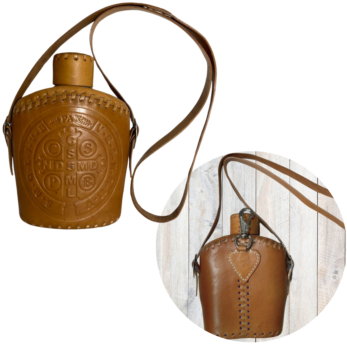 Cantil Couro De Medalha de São Bento Com Mosquetão Para Pendurar No Arreio e Sela
