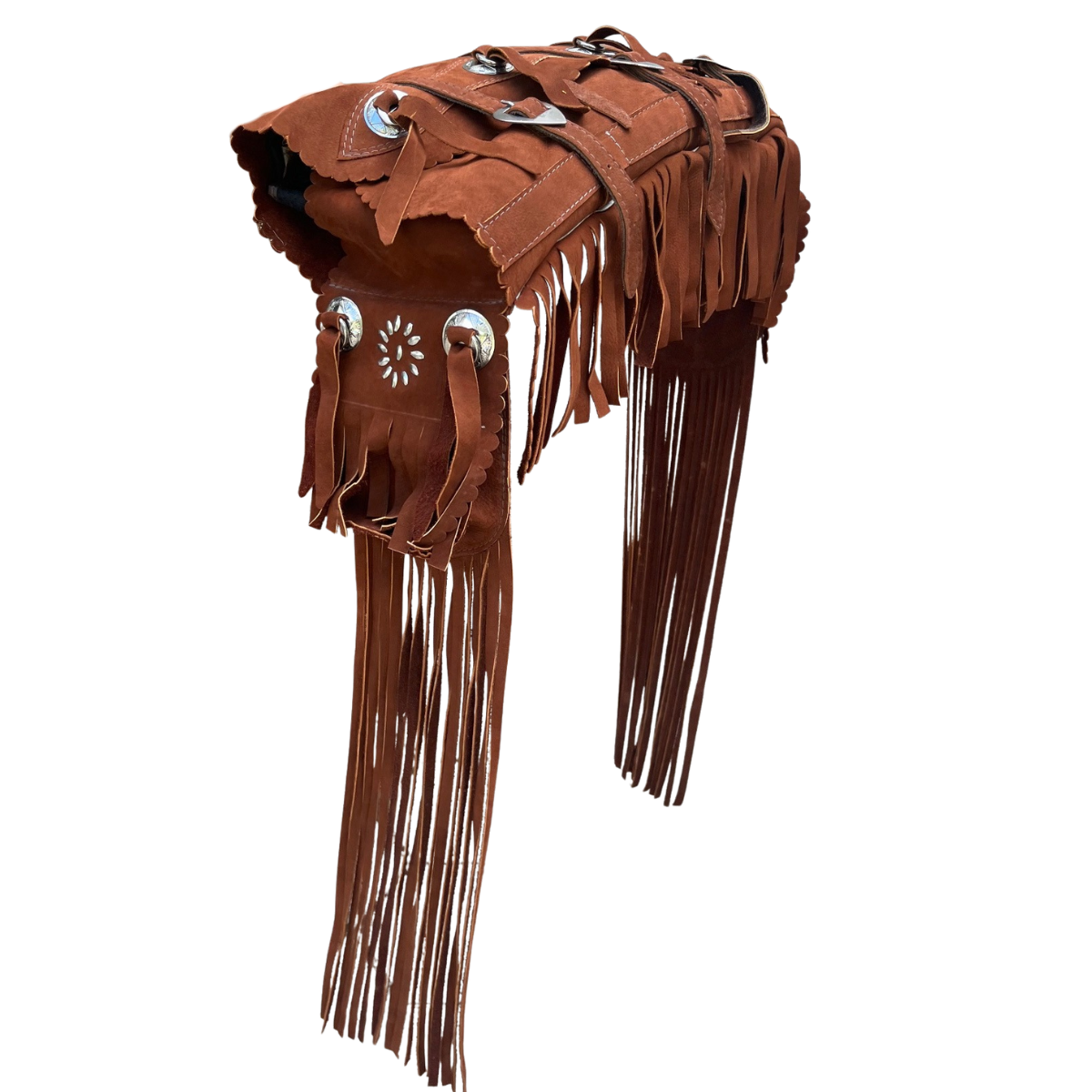 -Confeccionada em couro legitimo com margaridas cromadas, ferragens em aço inox com franjas em couro.